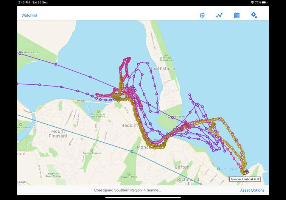 This screenshot shows the tracks of the searches conducted by our two vessels. The thin purple line is the helicopter’s track.