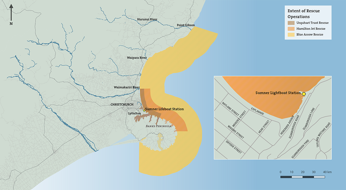 We cover over 4,500km2 of coastal waters, from Port Gibson just north of the mouth of the Hurunui River, to south west of Banks Peninsula, near Birdlings Flat. The operational area of the Sumner lifeboats is shown on this chart.